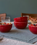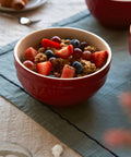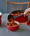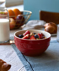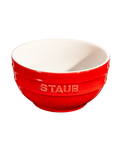 STAUB - Ceramic Round Bowl Cherry - 14cm Product Details The elegance and functionality of Staub ceramics goes from freezer to oven to table. The glass porcelain finish matches Staub's cast iron to mix perfectly on your table top. Oven and broiler safe up to 572F, ceramics can also be used in the microwave and are dishwasher safe. Highly scratch, impact, and thermal shock resistant. The Staub Ceramic Round Bowl is a veratile addition to any kitchen. Store salt and pepper on the counter for quick access, bake up individual deserts, or serve your favorite mac & chees recipe.