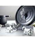 The animal lid knob “snail” replaces the usual handle for Staub cocottes. It fits all casserole dishes with a diameter between 18 and 41 cm. Simply replace the original lid knob to add a touch of individuality to your dishes. The silver knob in the shape of a snail with shell is made of stainless steel. Serve your stews and other delicious dishes lovingly and in an original way in your cocotte with the snail knob from the Staub Accessories range.