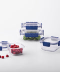 Borosilicate glass containers with a stackable Tritan lid for more efficient storage and added durability