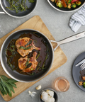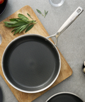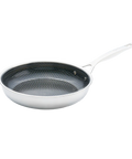 Hybrid cookware that offers the best of both worlds, the durability of stainless steel with the easy cleanup of non-stick. Combining the best properties of premium quality stainless steel and non-stick; performance, durability and convenience all in one elegant, hand polished pan. The body is made from 3 Ply construction - stainless steel / aluminium / stainless steel, which guarantees superior heat distribution, for even cooking and the perfect sear! The stainless-steel honeycomb mesh grid is scratch-resistant, metal utensil safe, extends all the way up the sides of the pan and protects the ceramic non-stick coating.