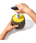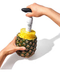 The Oxo Good Grips Pineapple Slicer cores and slices a whole pineapple quickly and easily. Simply slice off the top of fresh pineapple and twist the Slicer onto the exposed fruit to create perfect pineapple rings. The ratcheting handle makes it easy to core pineapples quickly without having to remove and replace your hand with each twist. Measurement markings on the Slicer determine your pineapple's height before slicing so you know when the Slicer is about to reach the bottom of the fruit.