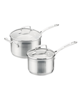 This Impact 2 Piece Set comprises a 16cm/1.8L saucepan and a 20cm/3.5L saucepan.