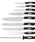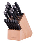 The largest block set in the SCANPAN Classic range, this comprehensive 15 piece set includes 6 x 12cm steak knives, a 9cm paring knife, 11.cm vegetable knife, 15cm utility knife, 20cm bread knife, 20cm chef's knife, 20cm carving knife, 15cm carving fork and sharpening steel all in a beechwood block