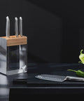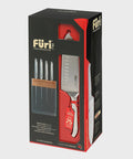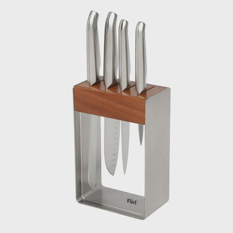 Contains: Paring Knife 9cm (3.5 inch), Utility Knife 15cm (6 inch), East/West Santoku Knife 17cm (7 inch), Bread Knife 20cm (8 inch), Clean Store Stainless Steel Storage Block.