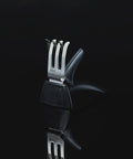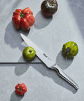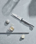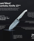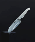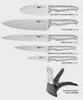 Contains: Paring Knife 9cm (3.5 inch), East/West Santoku Knife 13cm (5 inch), Serrated Multi-Purpose Knife 15cm (6 inch), Carving Knife 20cm (8 inch), Cook's Knife 20cm (8 inch), Diamond Fingers Knife Sharpener, Clean Store Stainless Steel Knife Block.
