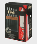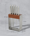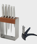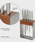 This quintessential knife set leads the way in taking the chore out of meal preparation and maintaining blade sharpness. Housed in a sleek and eye-catching knife block crafted from quality stainless steel and Teak, your kitchen will impress even the most discerning of guests.