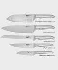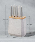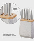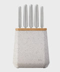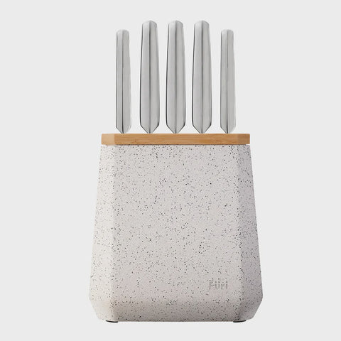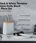 Contains an all-star knife configuration: East/West™ Santoku Knife 17cm (7 inch), Cook's Knife 20cm (8 inch), Bread Knife 20cm (8 inch), Utility Knife 15cm (6 inch), Asian Utility Knife 12cm (4.5 inches), Black & White Terrazzo Stone Block